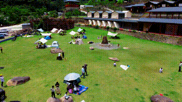 若离草坪茂密的青草,花枝招展的树,涂鸦集装箱,露营帐篷,休闲桌椅,雪白的栅栏。