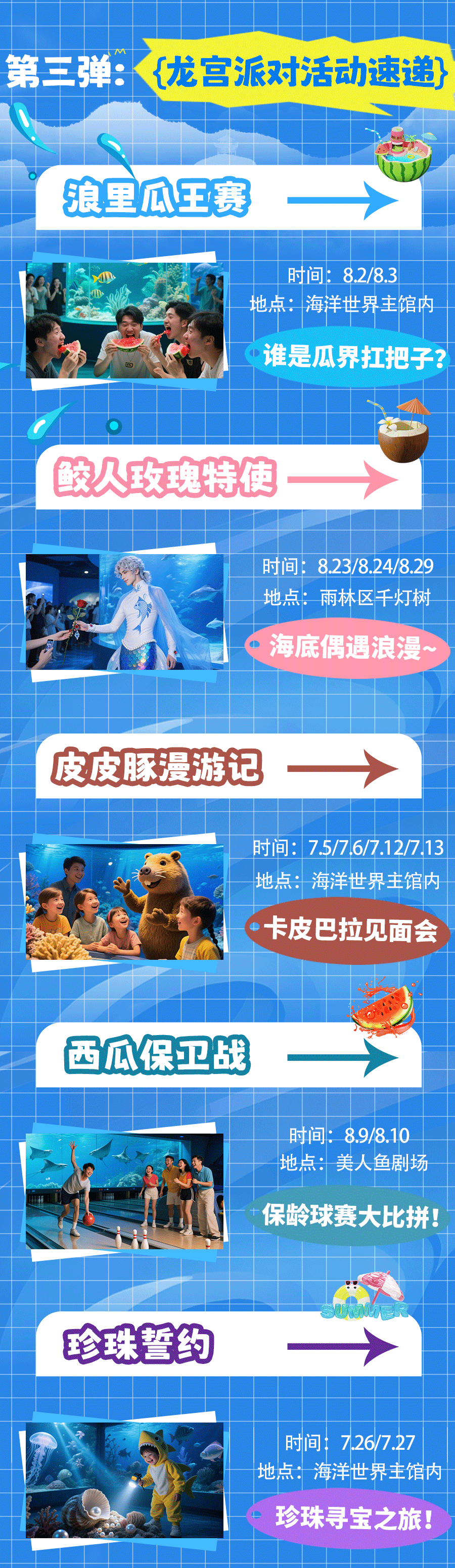 4、入园就餐时间:不含海洋世界门票(当天18:00后入园,18:30左右用餐);包含海洋世界门票(当天15:00后入园,18:30左右用餐)